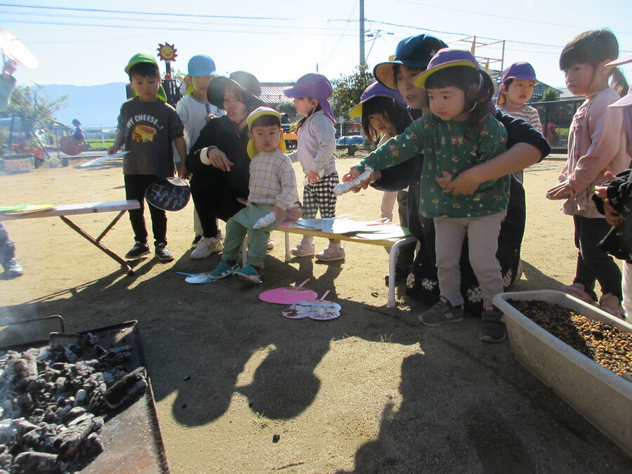 園庭に焚火を熾して準備してもらいました。