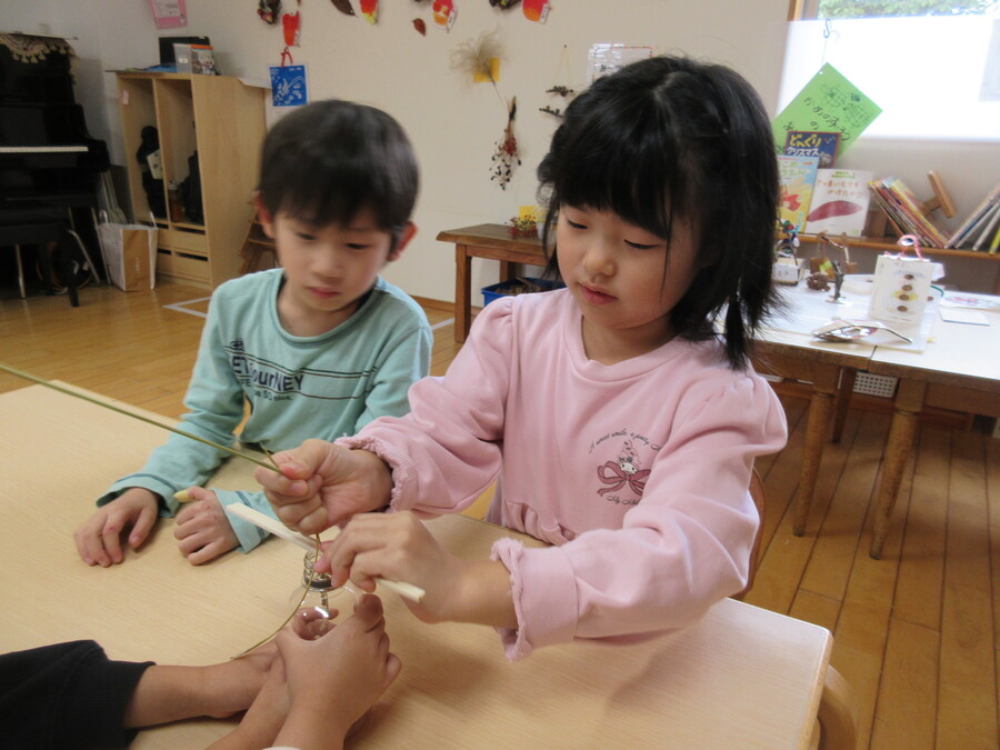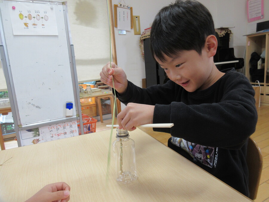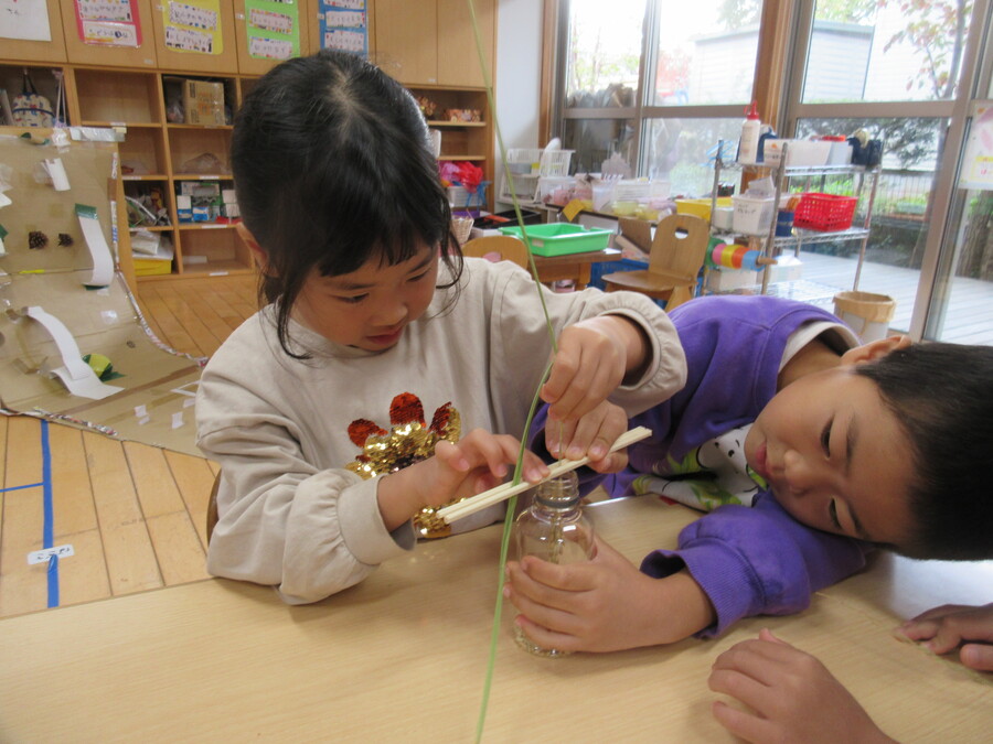 幼稚園で子どもたちは瓶と割りばしをつかって