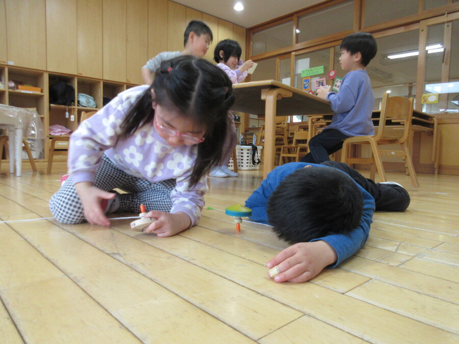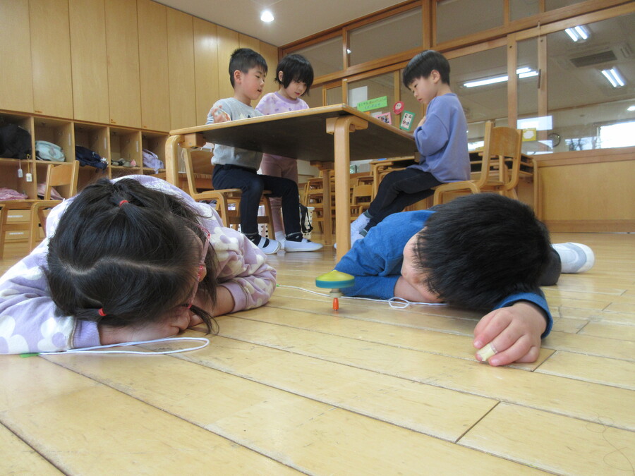 そのうち二人でコマを廻し始めました。