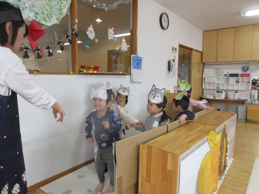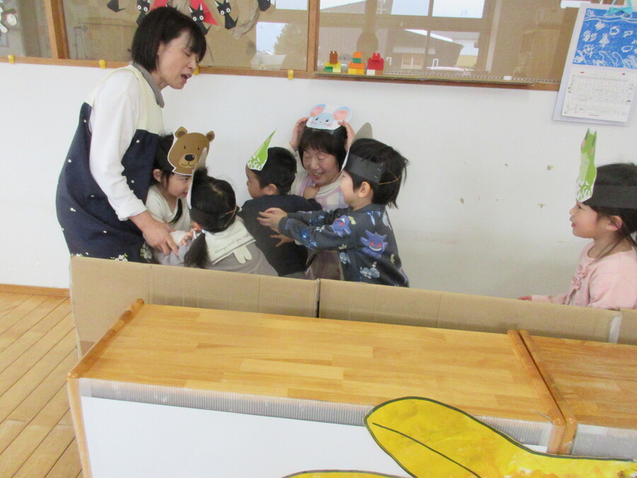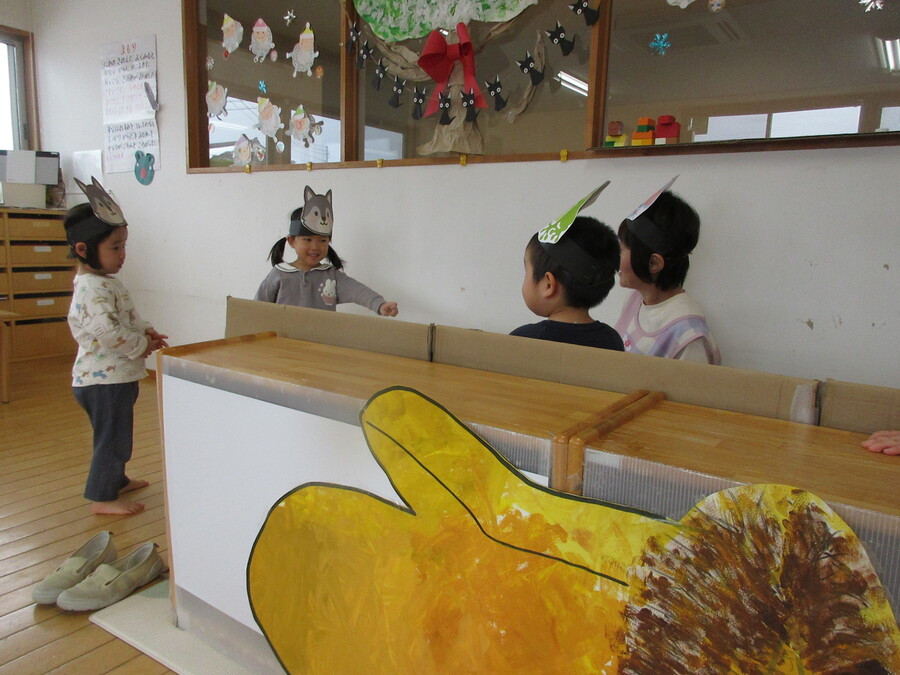 お話「手ぶくろ」の劇ごっこを先生と一緒に楽しんでいます。