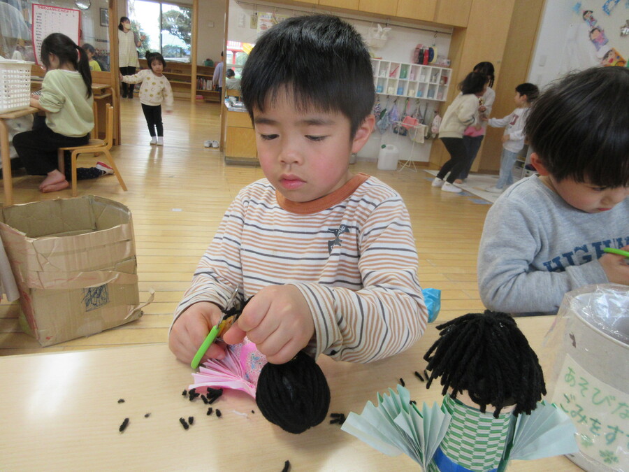 黒い毛糸でお人形のかみのけをつけて、